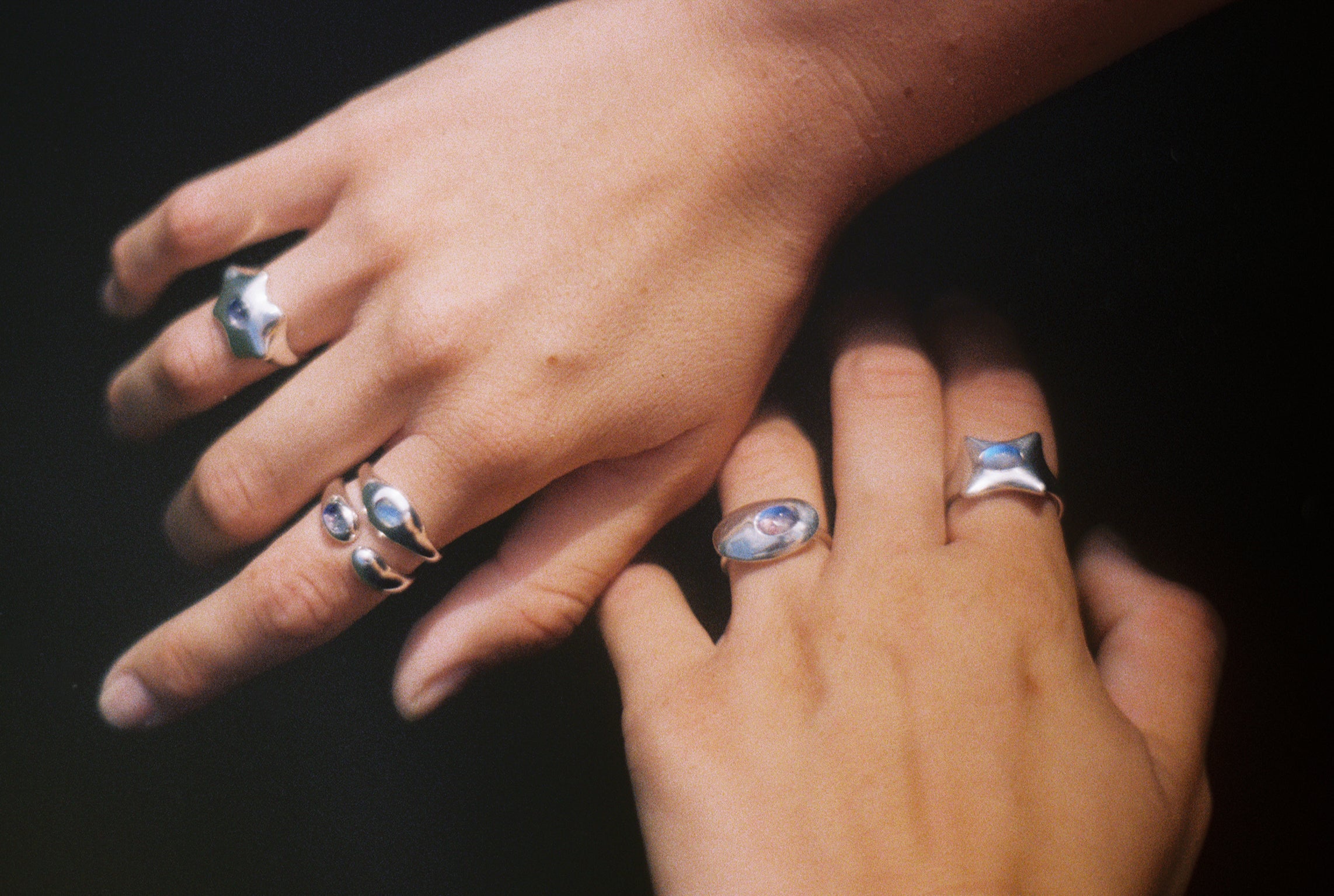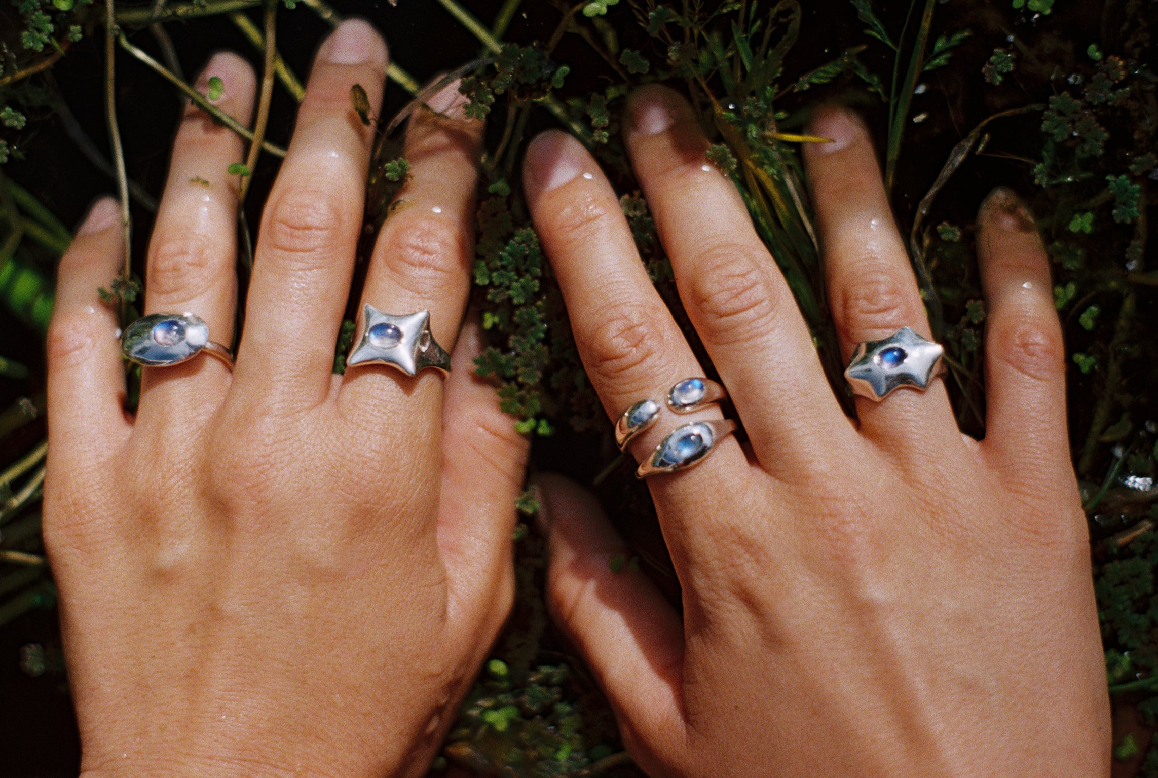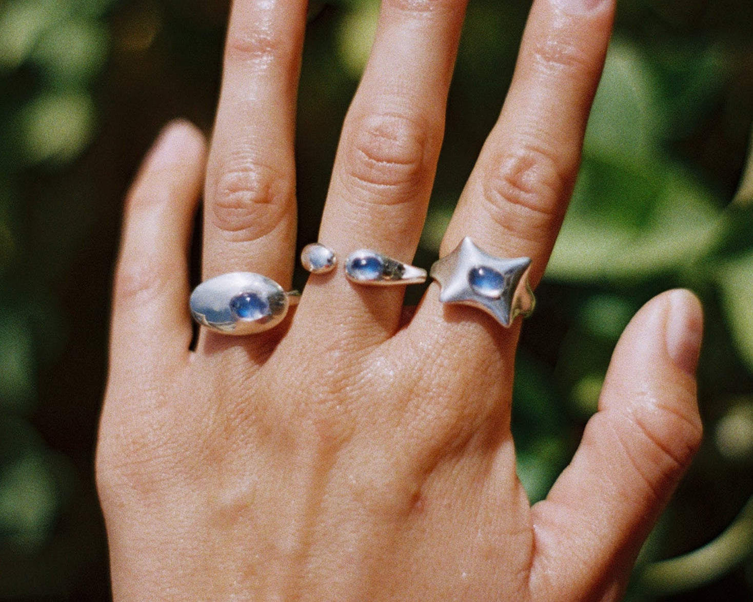 A collection of five sterling silver rings crowned with natural moonstones.